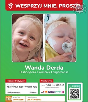 Wanda miała zaledwie siedem miesięcy, gdy rodzice usłyszeli najgorsze słowa: nowotwór złośliwy – rzadki, wieloukładowy i wieloogniskowy - histiocytoza z komórek Langerhansa. Byli przerażeni, bezradni i pełni pytań bez odpowiedzi. Na kolejne dwa miesiące mała Wandzia została zamknięta w czterech ścianach szpitala, z dala od domu, w Instytucie Matki i Dziecka w Warszawie. To były dwa długie miesiące wypełnione badaniami, zastrzykami, kroplówkami, lekami, przetoczeniami krwi, chemioterapią i sterydami. Zmiany nowotworowe były rozsiane po całym jej malutkim ciałku – jej skórę pokrywały liczne krostki. Po wyjściu ze szpitala, Wandzia przez rok przyjmowała chemię, sterydy oraz inne leki.