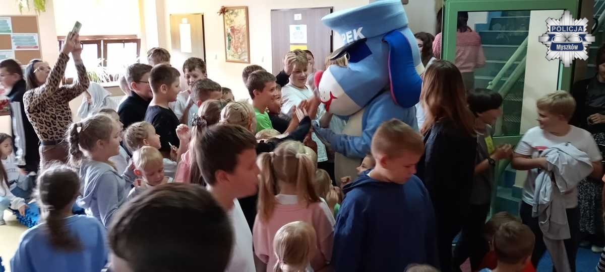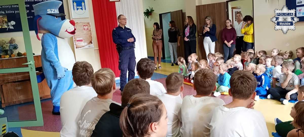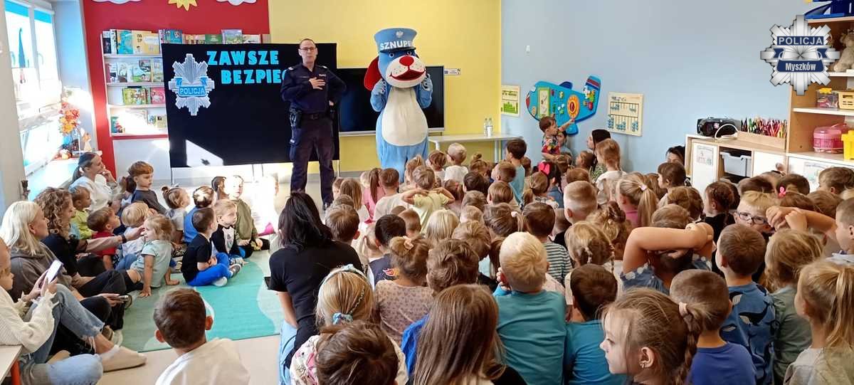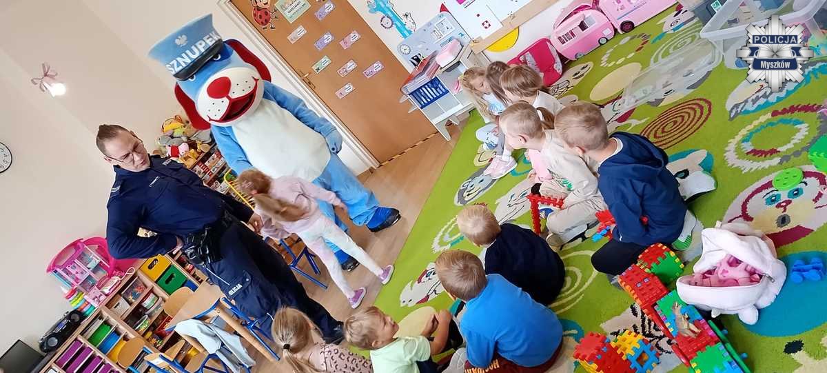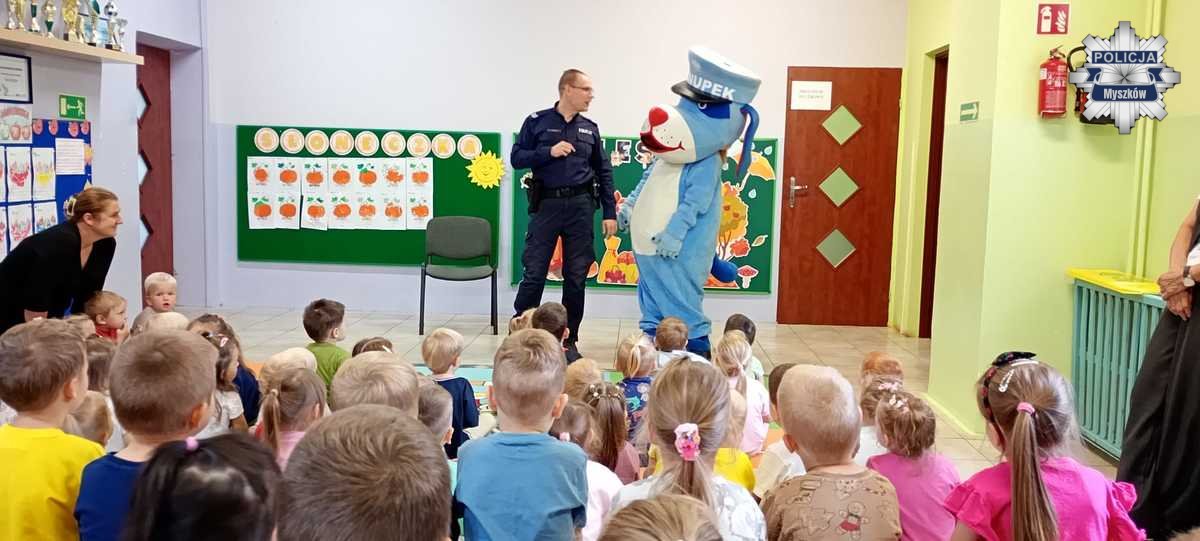 W tym tygodniu policyjny profilaktyk odwiedził kilka przedszkoli i szkół na terenie powiatu myszkowskiego. Była to doskonała okazja, aby poprzez zabawę przypomnieć maluchom o podstawowych zasadach bezpieczeństwa w domu, na podwórku oraz na ulicy.