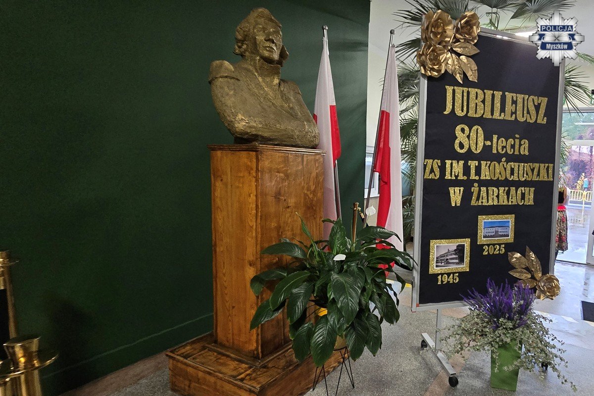 24 października I Zastępca Komendanta Powiatowego Policji w Myszkowie wziął udział w uroczystych obchodach 80-lecia Zespołu Szkół im. Tadeusza Kościuszki w Żarkach. W jubileuszowym wydarzeniu uczestniczyli przedstawiciele władz samorządowych, instytucji, służb mundurowych, a także nauczyciele, uczniowie i absolwenci szkoły.