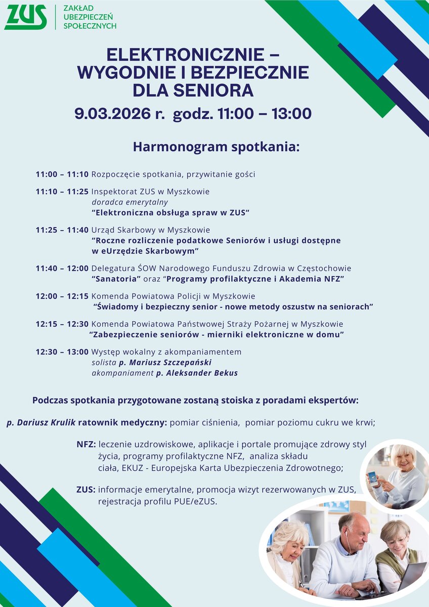 Zaproszenie Powrót Drukuj Zapraszamy na spotkanie "Elektronicznie- wygodnie i bezpiecznie dla seniora" , która odbędzie się w dniu 09.03.2026 roku o godzinie 11.00 w Inspektoracie ZUS w Myszkowie. Harmonogram