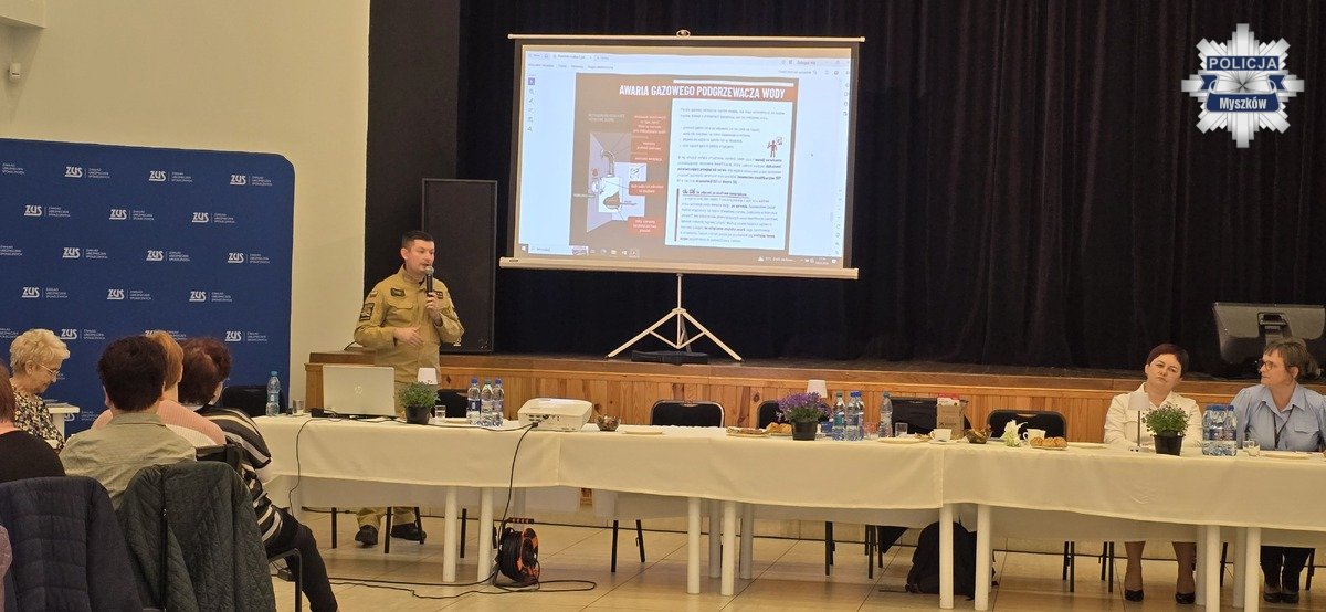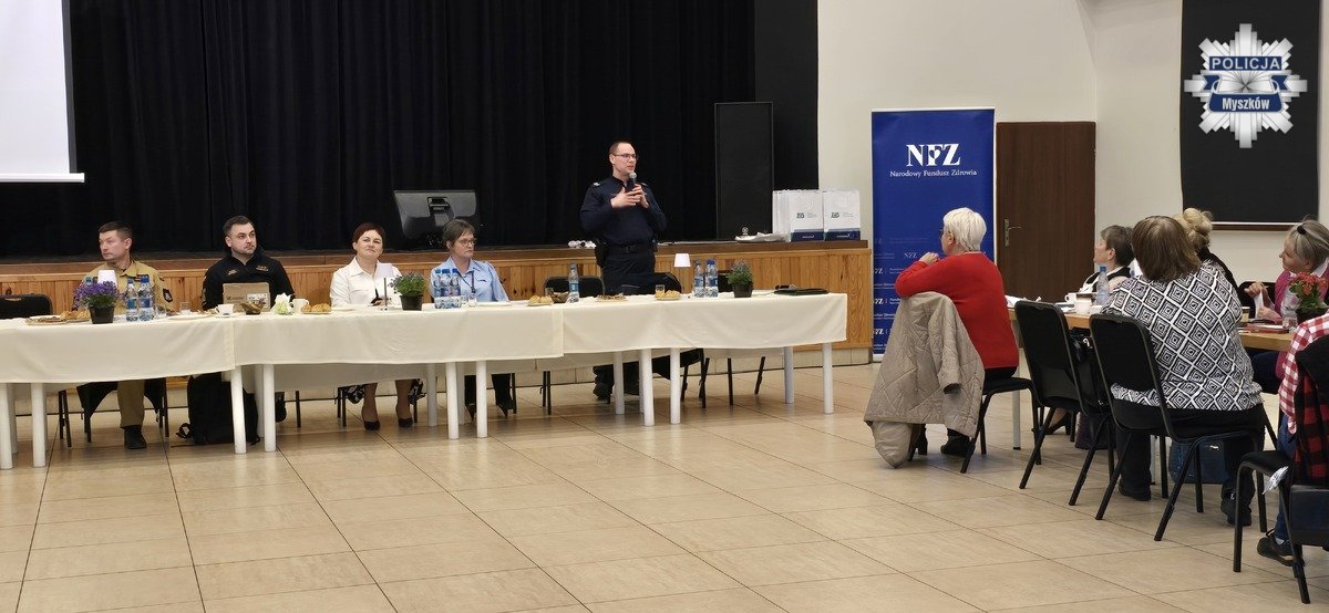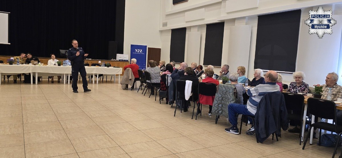 Jednym z ważniejszych punktów spotkania było wystąpienie policjantów z Komendy Powiatowej Policji w Myszkowie. Podczas prelekcji funkcjonariusze omówili najczęściej stosowane metody oszustw, których ofiarami padają seniorzy. Policjanci zwrócili szczególną uwagę na przestępstwa „na wnuczka”, „na policjanta”, a także oszustwa telefoniczne i internetowe, w których sprawcy podszywają się pod pracowników instytucji lub bliskie osoby.
