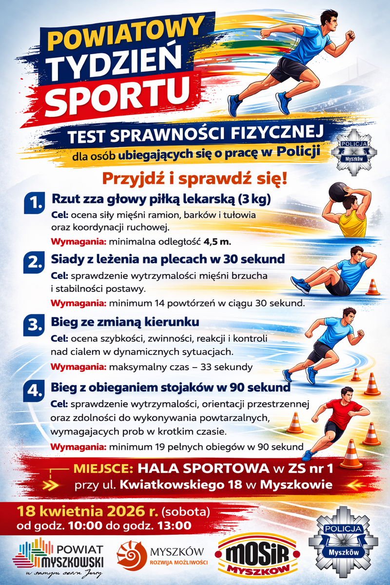 Już wkrótce mieszkańcy naszego powiatu będą mieli wyjątkową okazję sprawdzić swoją kondycję fizyczną oraz zmierzyć się w sportowej rywalizacji. W ramach Powiatowego Tygodnia Sportu organizowany jest Turniej Sprawności Fizycznej o Puchar Komendanta Powiatowego Policji w Myszkowie.
